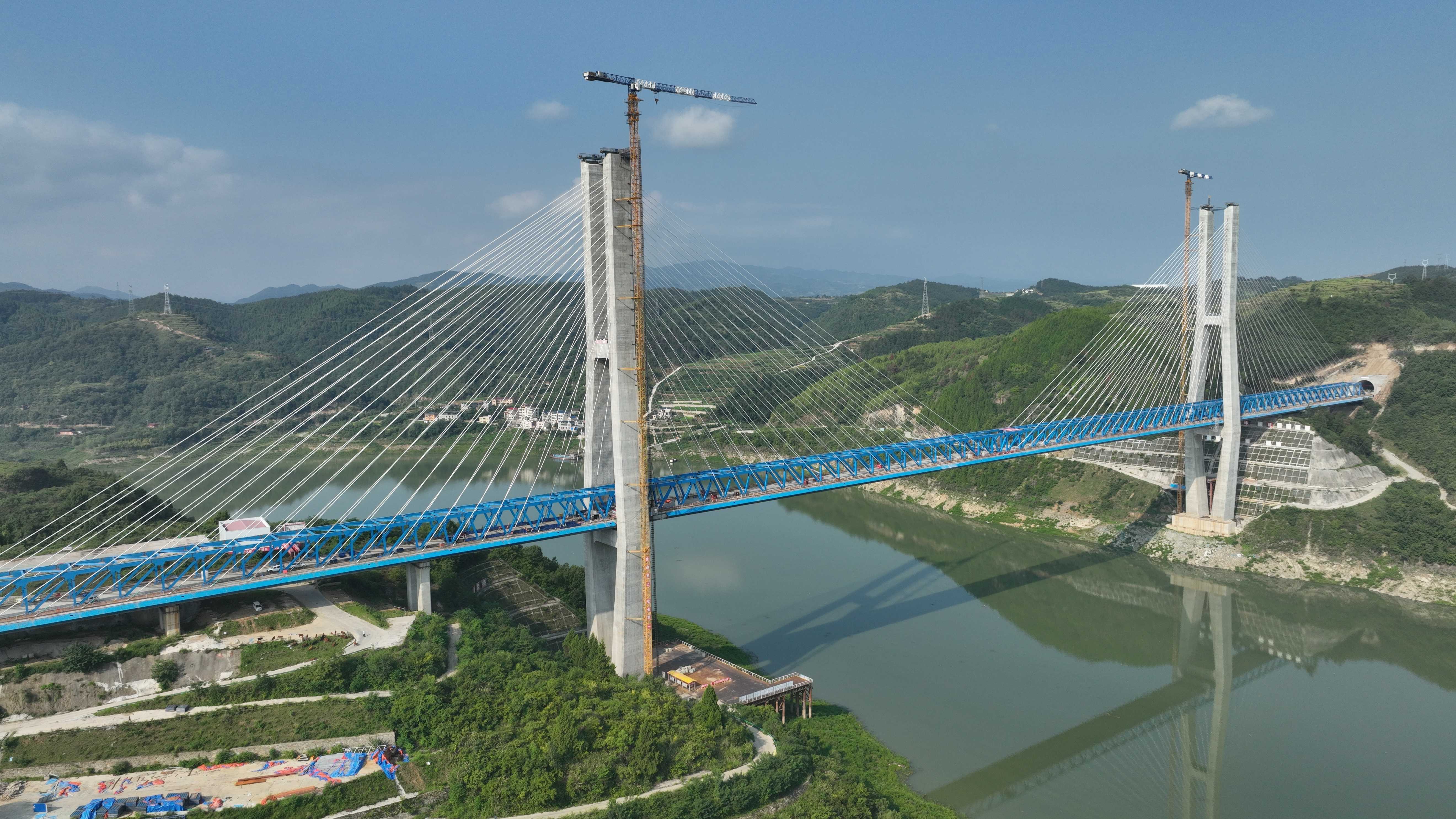 该桥采用的梁桁组合结构是一种新型桥梁结构形式,为国内首次在高速铁路斜拉桥上使用。施工中,建设者在混凝土主梁悬臂施工时同步预埋钢桁梁下弦节点,待混凝土主梁施工完成后再在其上安装钢桁梁杆件。梁桁组合结构能有效控制温度引起的变形,保证刚度分布均匀,满足高速列车行驶过程中对轨道平顺性和行车舒适性要求,同时兼具造型美观、经济环保等优点。