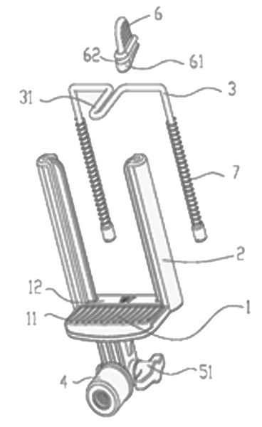 在其中一个无效宣告请求中,请求人使用发明名称为“一种手持式遥控拍摄装置的拍摄设备夹持装置”的实用新型专利作为证据(下称证据1),来评述权利要求2的创造性。请求人认为证据1公开了夹紧结构包括活动杆3,该活动杆3的两端可拉伸地设置于两支撑臂内,中部设有弯折结构31,且该弯折机构31位于载物台的上方,即证据1公开了在夹紧机构上设置折弯部的技术方案。