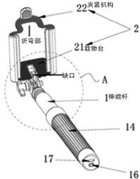 通过对证据1公开内容的仔细分析不难发现,证据1中弯折结构的中部开口用于与提手上的凹槽卡接,将提手固定在活动杆的中部,以方便活动杆的上下移动,从而夹紧拍摄设备。这与涉案专利中的折弯部的功能和作用完全不同:涉案专利的折弯部具有一个U形开口,其与载物台上的缺口共同形成了容纳折叠后的伸缩杆的收纳空间,从而实现自拍杆的小型化和便携性。因此,虽然证据1中的弯折结构与涉案专利的折弯部在文字表述上相近,在结构上类似,但是证据1中的弯折结构是用于与提手耦合,在与提手固定连接以后,不再具有任何空间,不可能用于收纳。因此,不能认为证据1公开了涉案专利的折弯部,也没有给出将其用于收纳的技术启示。