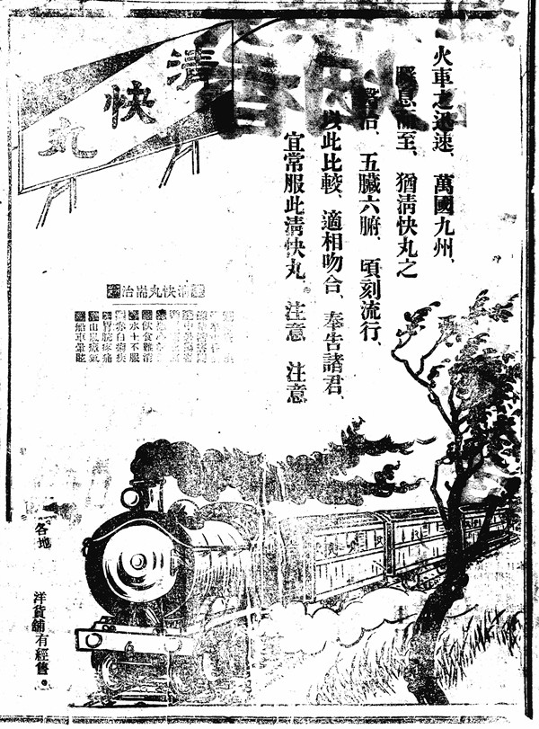1909年、1911年的广告则重点强调其物美价廉、药到病除的效果。到了1920年,清快丸广告再次出现在《汉口日报》上时,广告风格变得与民国之前截然不同:“火车之迅速,万国九州,瞬息而至,犹清快丸之医治,五脏六腑,顷刻流行,以此比较,适相吻合,奉告诸君,宜常服此清快丸,注意,注意。”