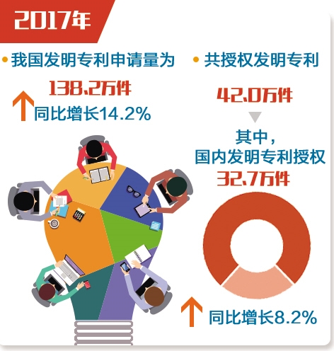 近日,国家知识产权局发布了2017年我国发明专利有关情况和企业排名。数据显示,2017年,我国发明专利申请量为138.2万件,同比增长14.2%。共授权发明专利42.0万件,其中,国内发明专利授权32.7万件,同比增长8.2%。专利事业迸发出量质齐升的澎湃动力,从知识产权大国迈向知识产权强国的步伐更加坚实有力。
