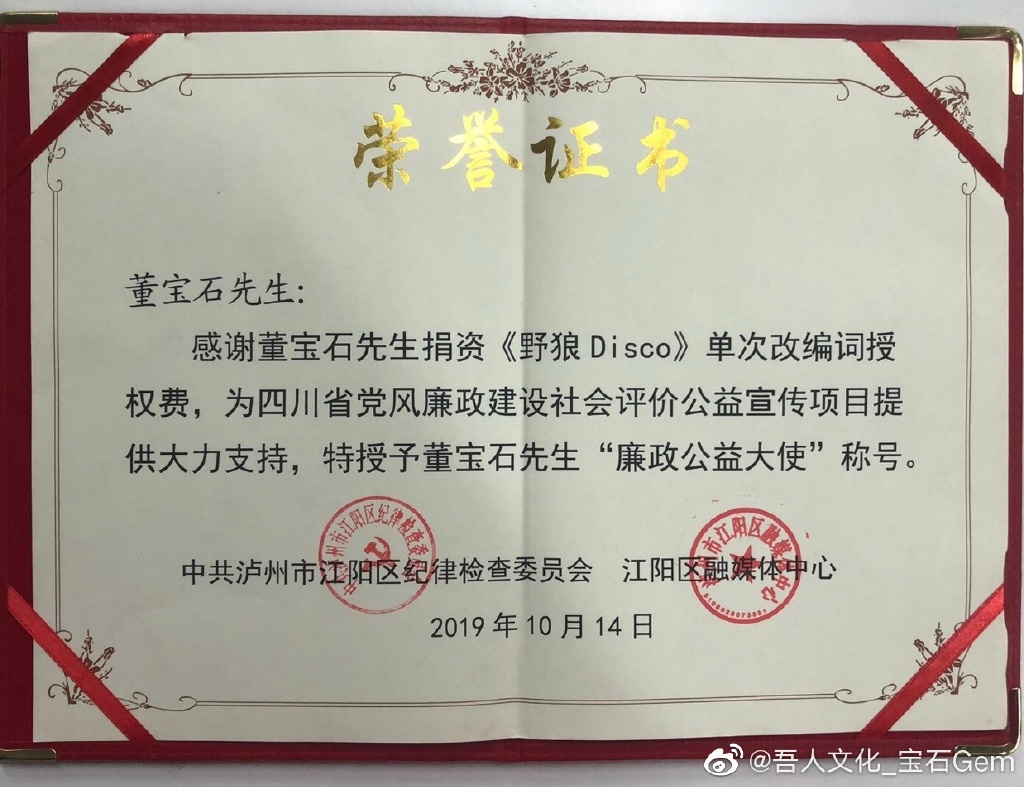 而这,已经不是@宝石Gem 第一次捐赠《野狼 disco》版权。2019年10月,他就在微博晒出过一张证书,显示其将《野狼disco》单次改编词授权费捐给了一个公益宣传项目。