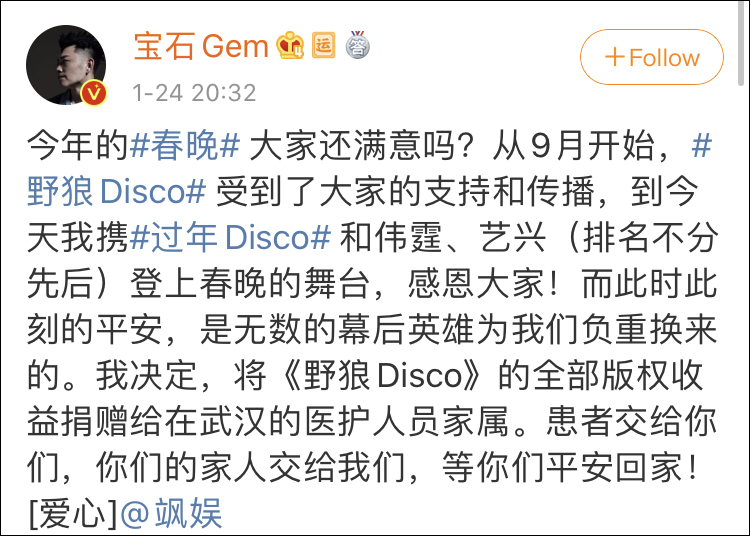 随后,宝石Gem不仅成了2020跨年晚会的“香饽饽”,更在除夕之夜带着改编后的《野狼disco》登上了央视春晚的舞台。春晚当天,@宝石Gem 便宣布将《野狼Disco》的全部版权收入捐赠给在武汉的医护人员家属,随后收获赞誉无数。