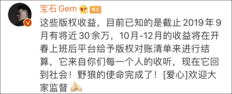 @宝石Gem 透露,截止2019年9月,《野狼disco》已获版权费30余万,10-12月的收益会在年后予以结算。