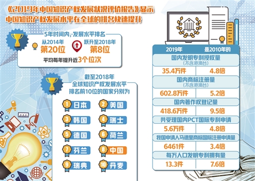 9月14日,中国国家知识产权局知识产权发展研究中心发布的《2019年中国知识产权发展状况评价报告》显示,中国知识产权发展水平在全球的排名快速提升,短短5年时间内,排名已从2014年的第20位,快速跃升至2018年的第8位,平均每年提升近3个位次。